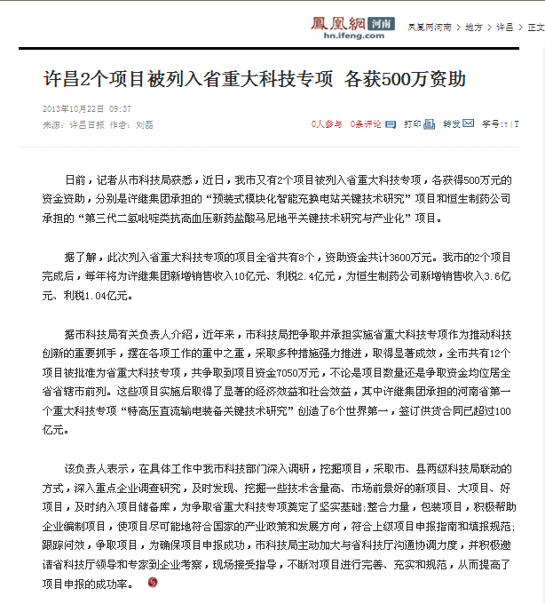 許昌恒生制藥有限公司的項(xiàng)目被列入省重大科技專項(xiàng)